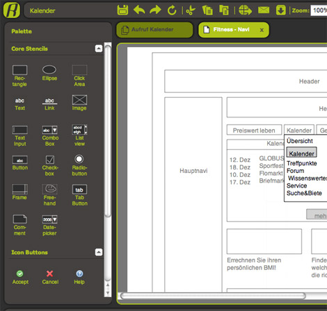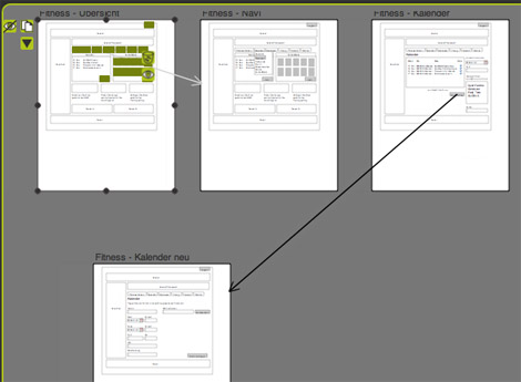 Um die so erstellen Seiten miteinander zu verknüpfen und so Usecases aufzubauen kann man Elemente – z.B. einen Button – mit einem Verweis auf eine andere Seite ausstatten. Der gesamte Usecases inklusive aller Wireframes kann dann am Ende als HTML-Seiten exportiert werden, auf diese Weise hat man schnell einen Klick-Dummy erstellt.