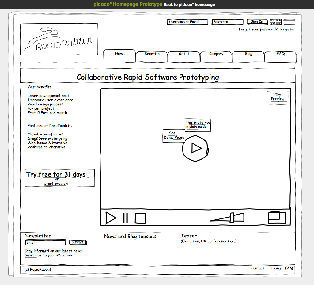 Schon ein bisschen länger am Markt ist RapidRabb, das nun einen neuen Namen bekommen hat und ab sofort Pidoco heißt. Wir erinnern uns: das besondere an Pidoco ist, dass man nicht nur Wireframes erstellen kann, sondern auch klickbare Prototypen. Ob mit dem neuen Namen auch neue Features hinzugekommen sind konnte ich aktuell noch nicht testen, sieht aber schwer danach aus.